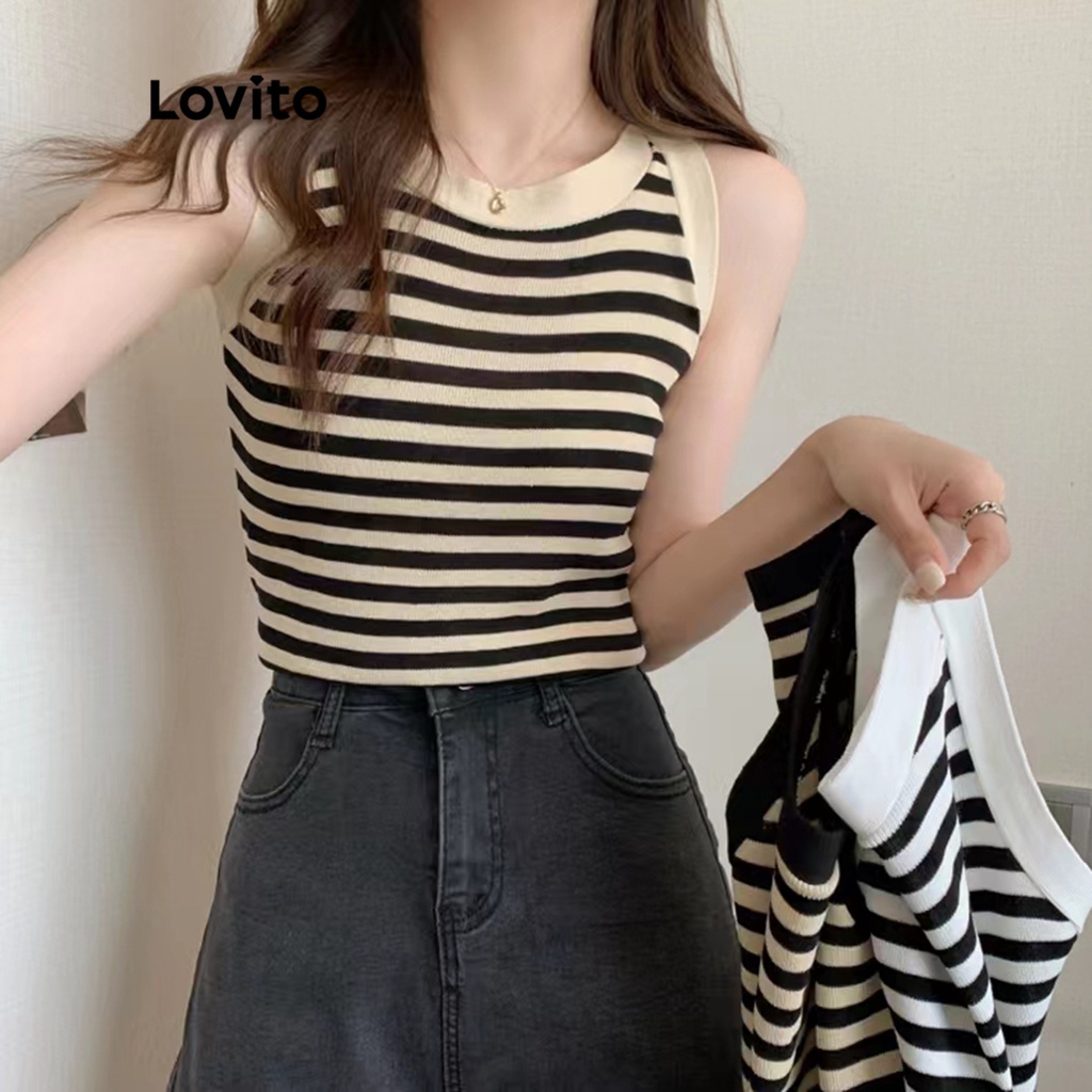 Lovito Blusa Casual Listrada de Gola Redonda e sem Mangas para Mulheres LNE06100 (Damasco/Preto)