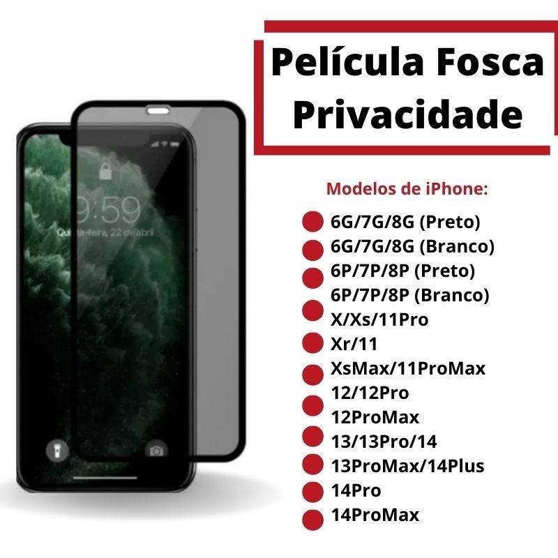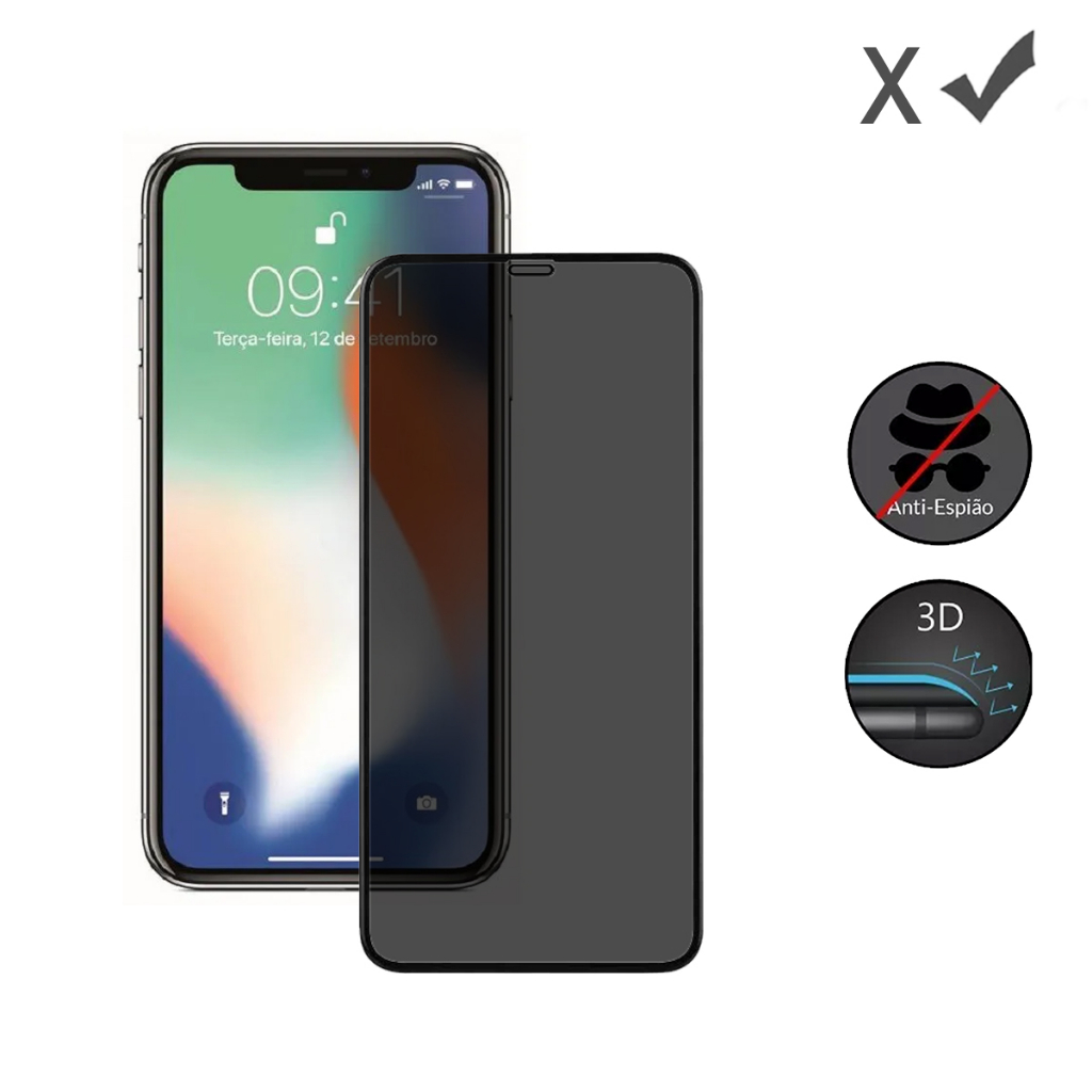 Pelicula de Vidro Fosca Privacidade Anti spy 3D para iPhone 6G/8Plus/Xs/11Pro/Xr/11/12/12Pro/14/14Plus/14Pro