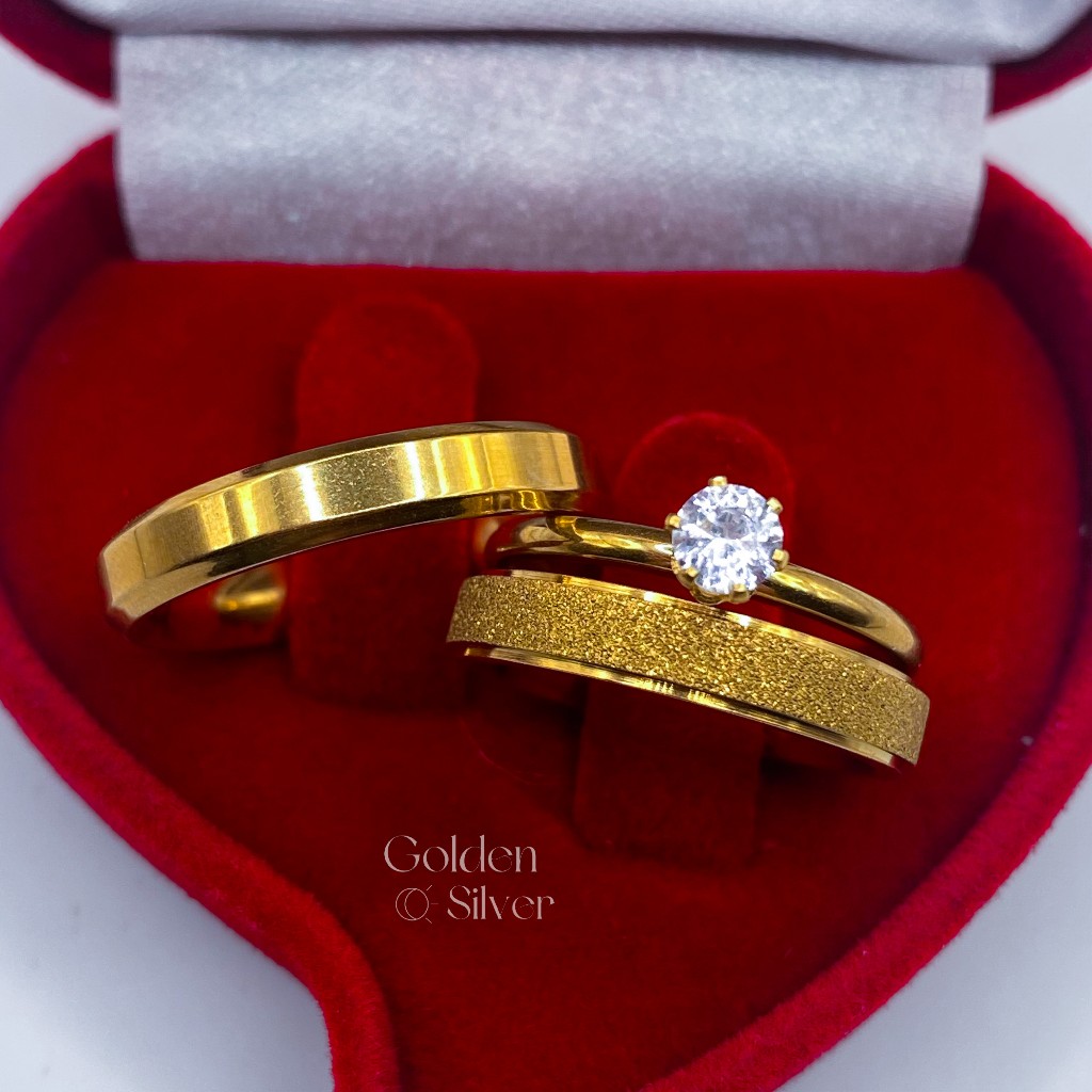 Par de Aliança de Namoro Casamento Dourada Brilhante e Chanfrada Casal 4mm + Anel Aparador 2mm