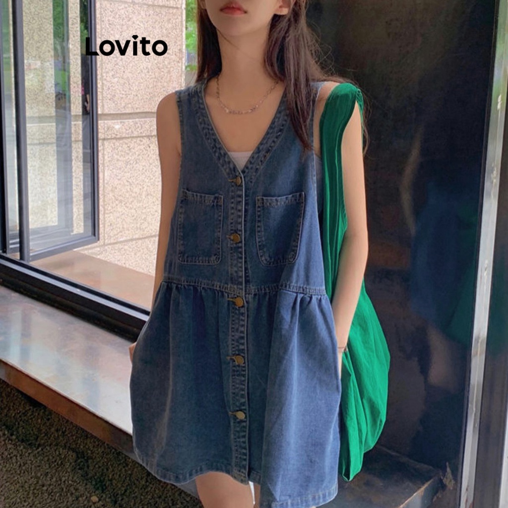 Lovito Casual Vestido Jeans A-Line com Botões Simples para Mulheres LNE21116 (Azul)