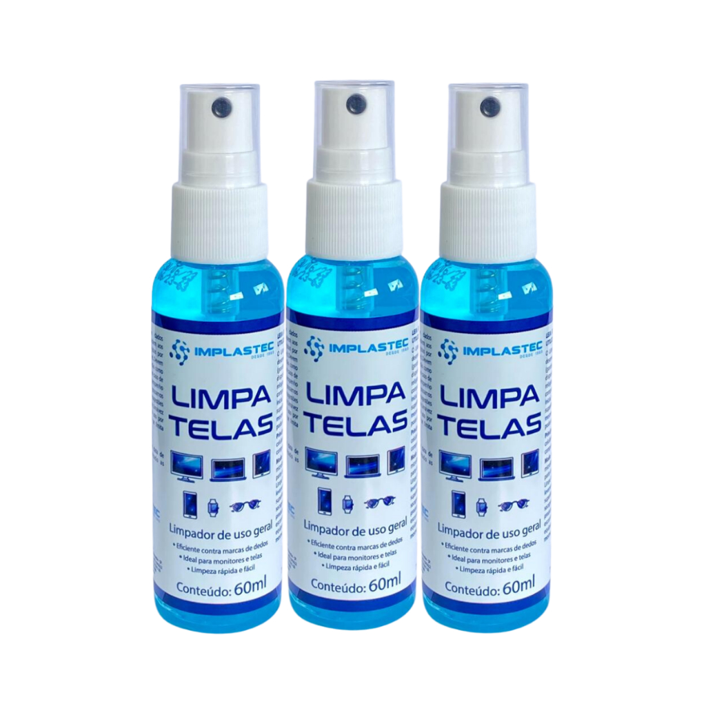 Kit com 3x Limpa Telas Implastec 60ml Remoção de manchas, marcas de dedos (gordura) e poeira de monitores, TV, Tablet