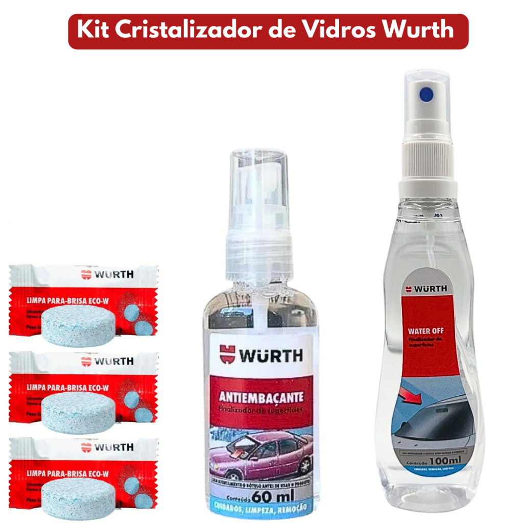 Kit 3 Unidades Cristalizador De Vidros Water Off 100ml + 1 Anti-embaçante 60ml + 3 Pastilhas Limpa Para-Brisa 9g Wurth