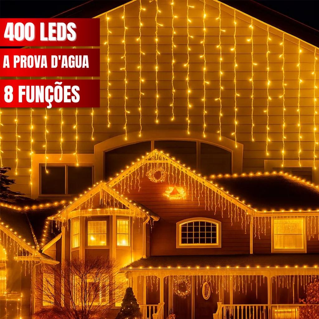 Cascata Natal 400 Lâmpadas Led Com 8 funções ou Fixo e 10 metros Fio Branco Pisca Pisca