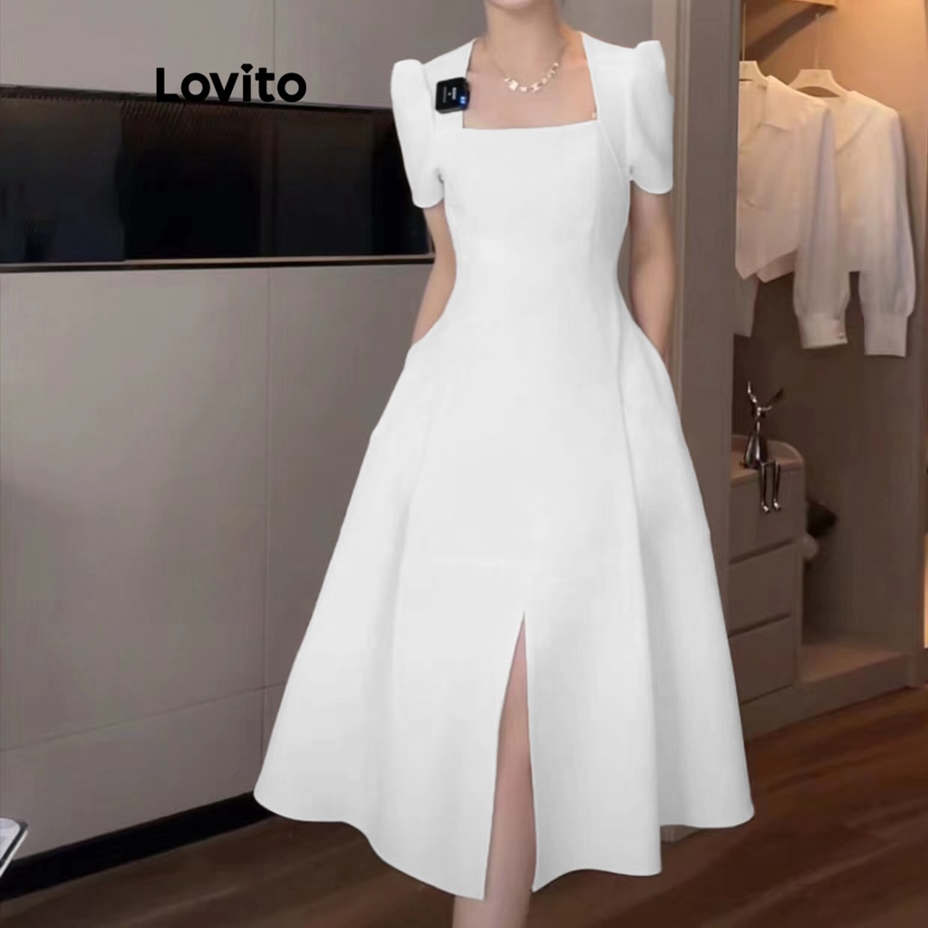 Lovito Vestido Simples com Divisão na Frente e Decote Quadrado para Mulheres LNE17122 (Branca)