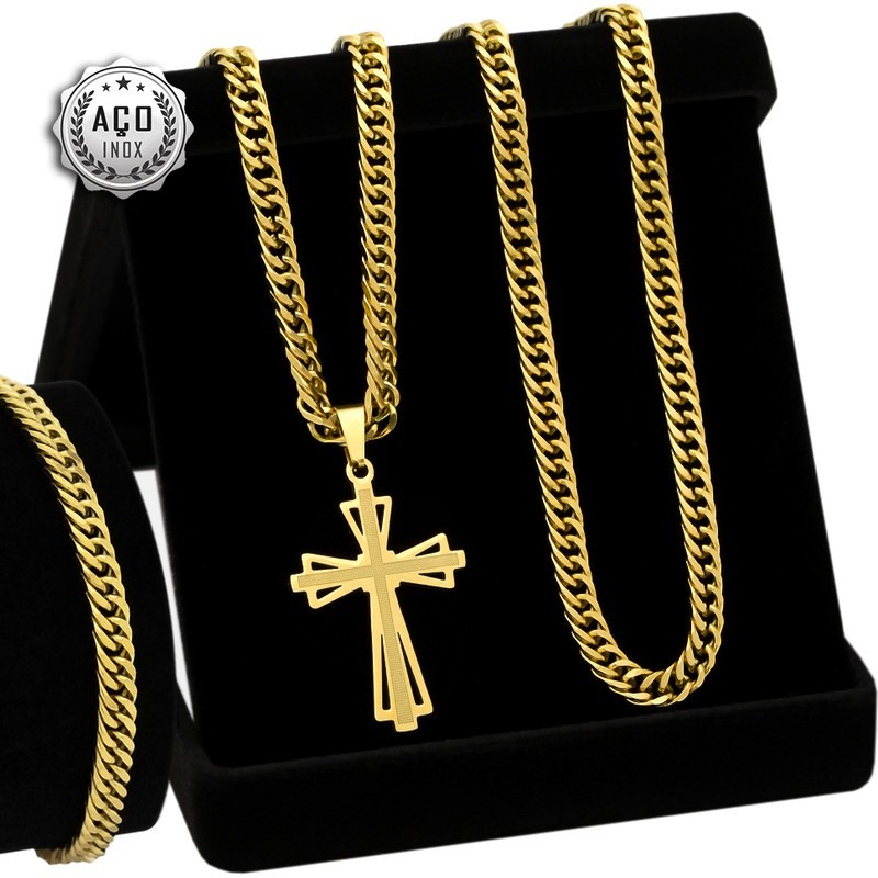 Conjunto Corrente Pulseira Aço Inox 316L Ouro Barato Cruz Masculino
