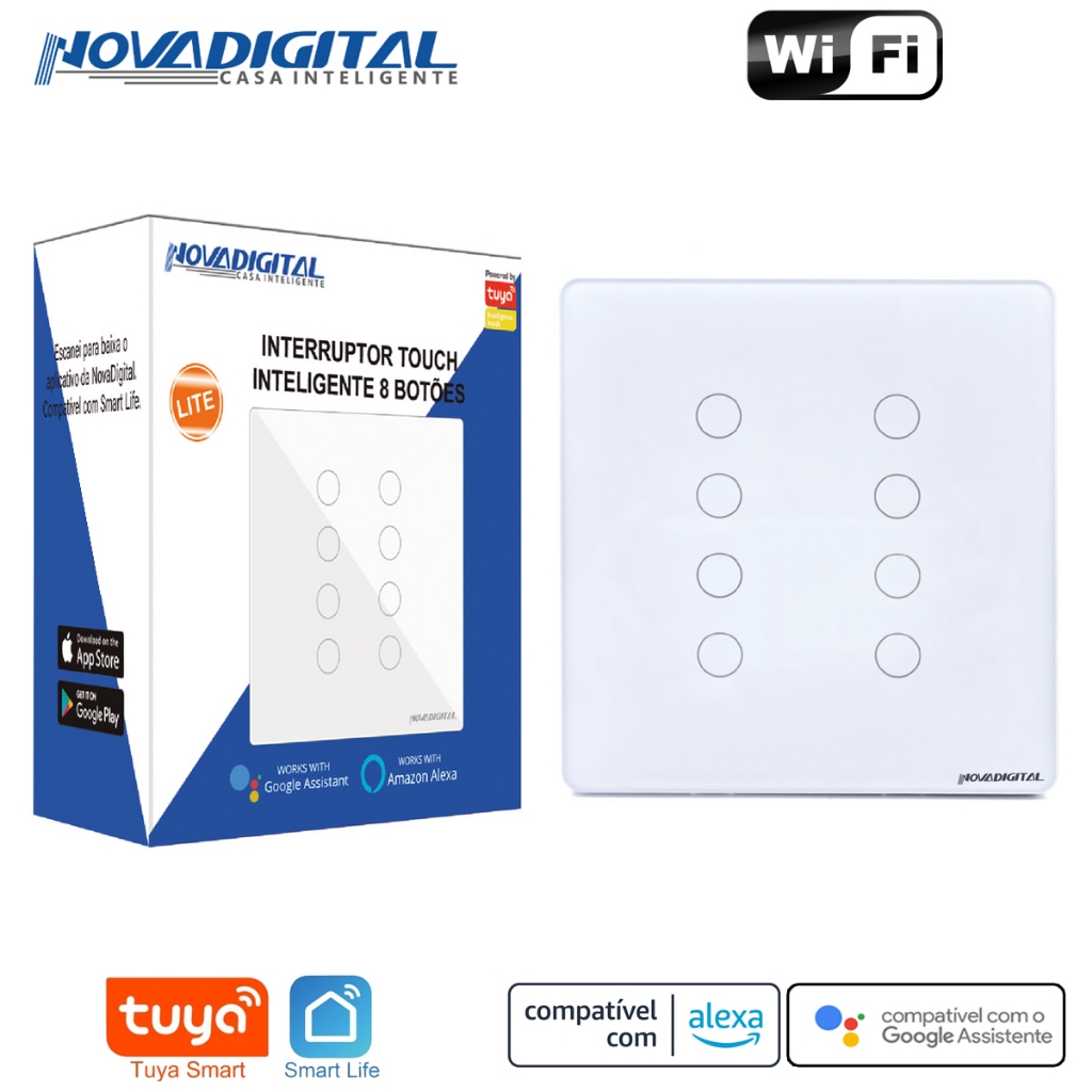 Interruptor Inteligente Smart Wi-Fi 4x4 de 8 Botões Tuya Nova Digital Compatível com Alexa e Google