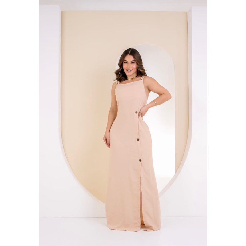 Vestido Liso Longo Com Duas Alça Botoes Laterais Fenda e Costa de Elastec