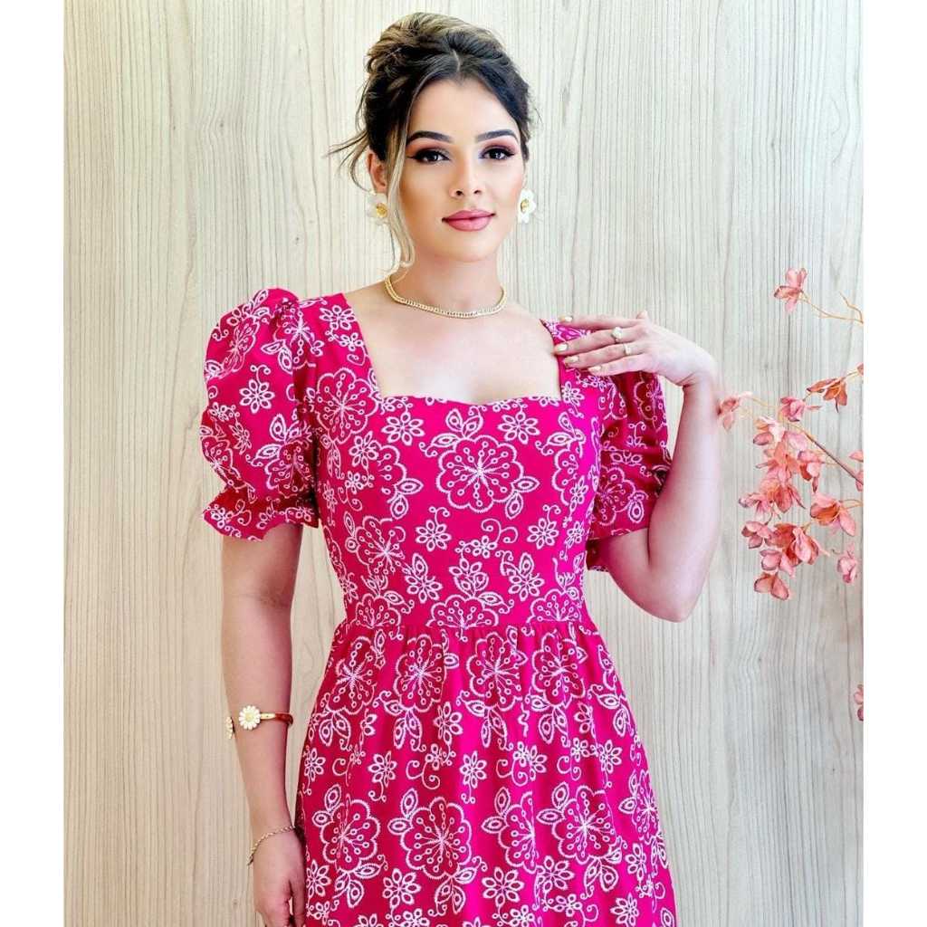 Vestido Pink estampa floral tecido 100% algodão manga bufante moda cristã tamanho único