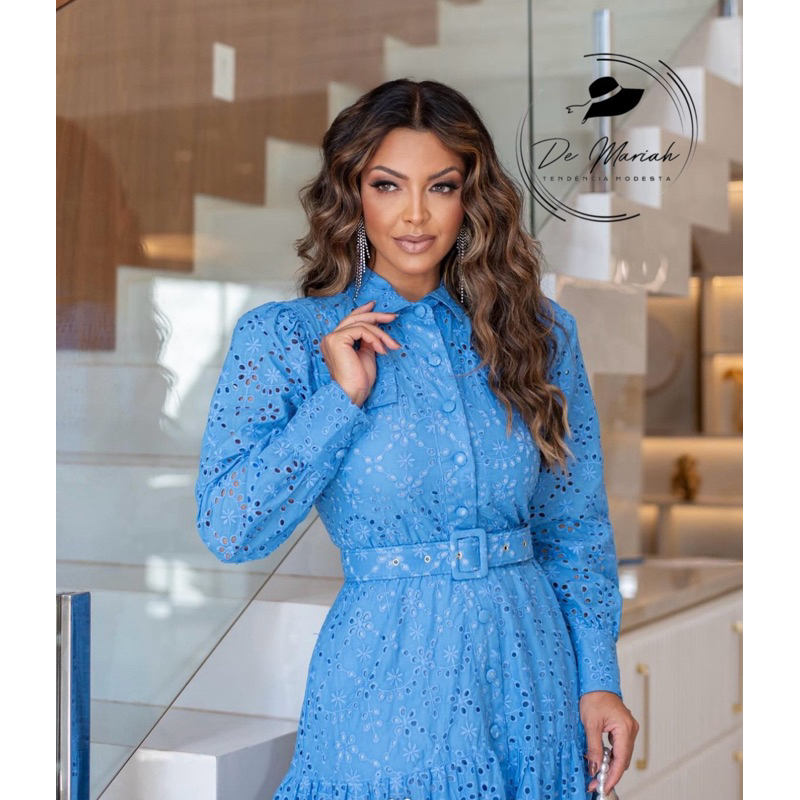 Vestido Estilo Chemise Feminino Longuete em Lese Laise 100% algodão Moda Feminina Cristã Evangélica Moderna Modesta Maxi Midi Longo Manga Longa Bolsos Botões Funcionais