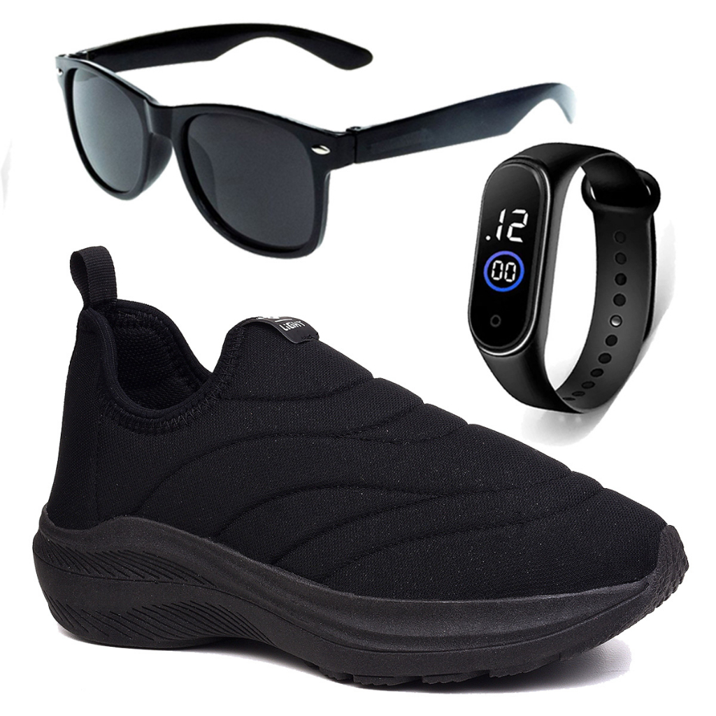 Tenis Infantil Menino e Menina Calce Facil Preto e Preto e Óculos e Relógio Atacadão da Emoção