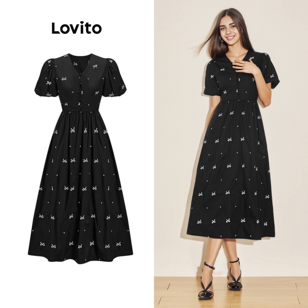 Lovito Vestido com Amarração de Bolinhas para Mulheres LNE19109 (Preto)