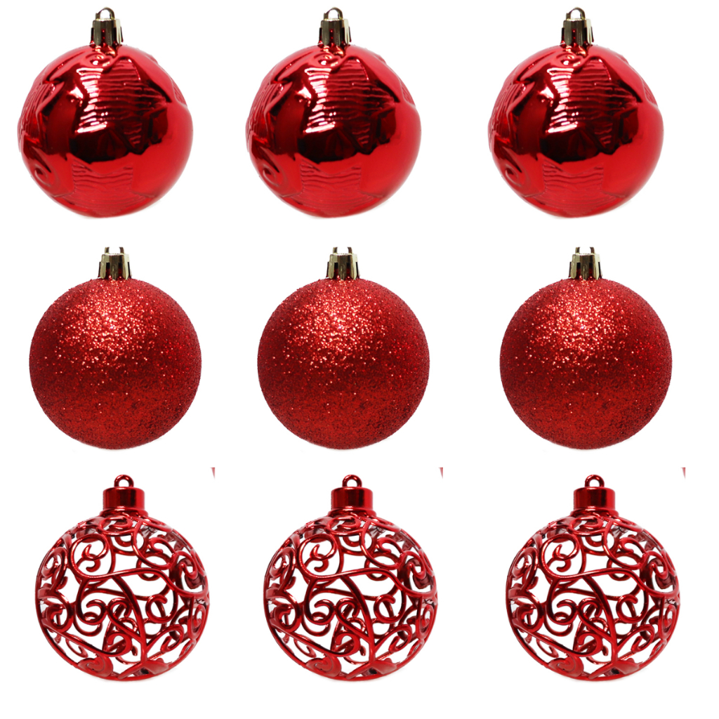 Kit com 9 Bolas de Natal 6cm Enfeite para Árvore Decorativo Brilho Glitter Vazado Relevo