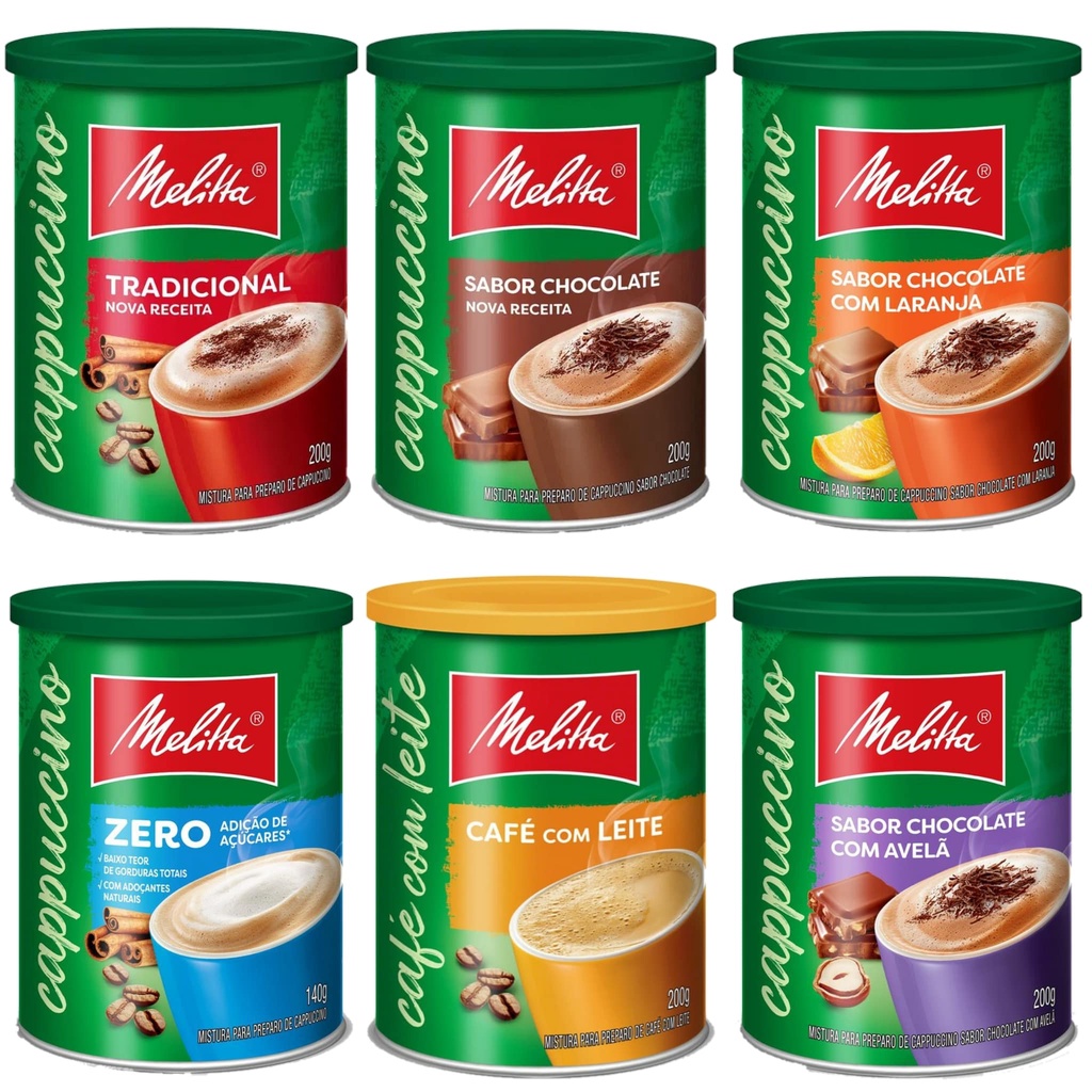 Kit 6un Cappuccino Melitta 200g café Solúvel com leite, Chocolate com avelã, laranja e Zero Açúcar s/Glúten Capuccino