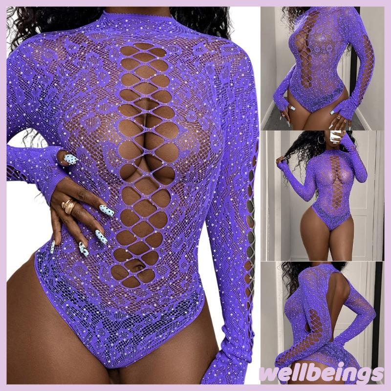 WELL Lingerie Feminina Arrastão Malha Bodysuit Strass Macacão Collant Roupa Dormir