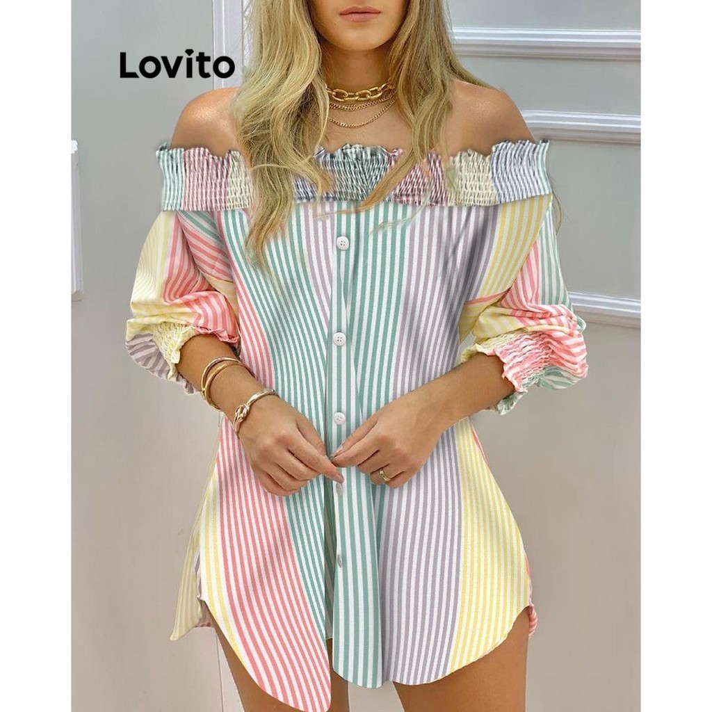 Lovito Blusa feminina casual com listras arco-íris e botões geométricos LNL72529