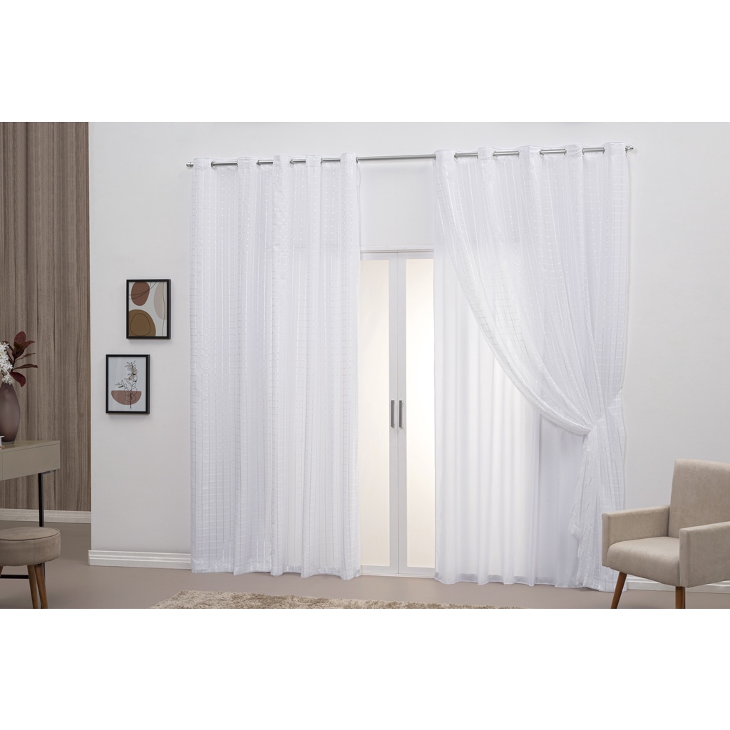 Cortina 3,00 x 2,60 Forro de Microfibra Com Voil Xadrez Branca