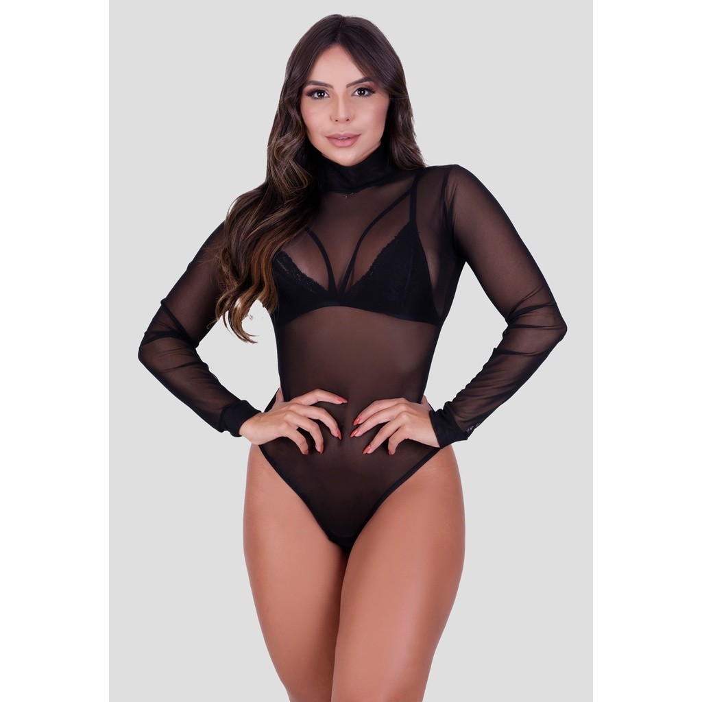 Body Feminino Bori Tule Preto Manga Longa Gola Alta Inverno Tendência Preto Branco Transparente Moda Blogueiras Lindo P ao GG