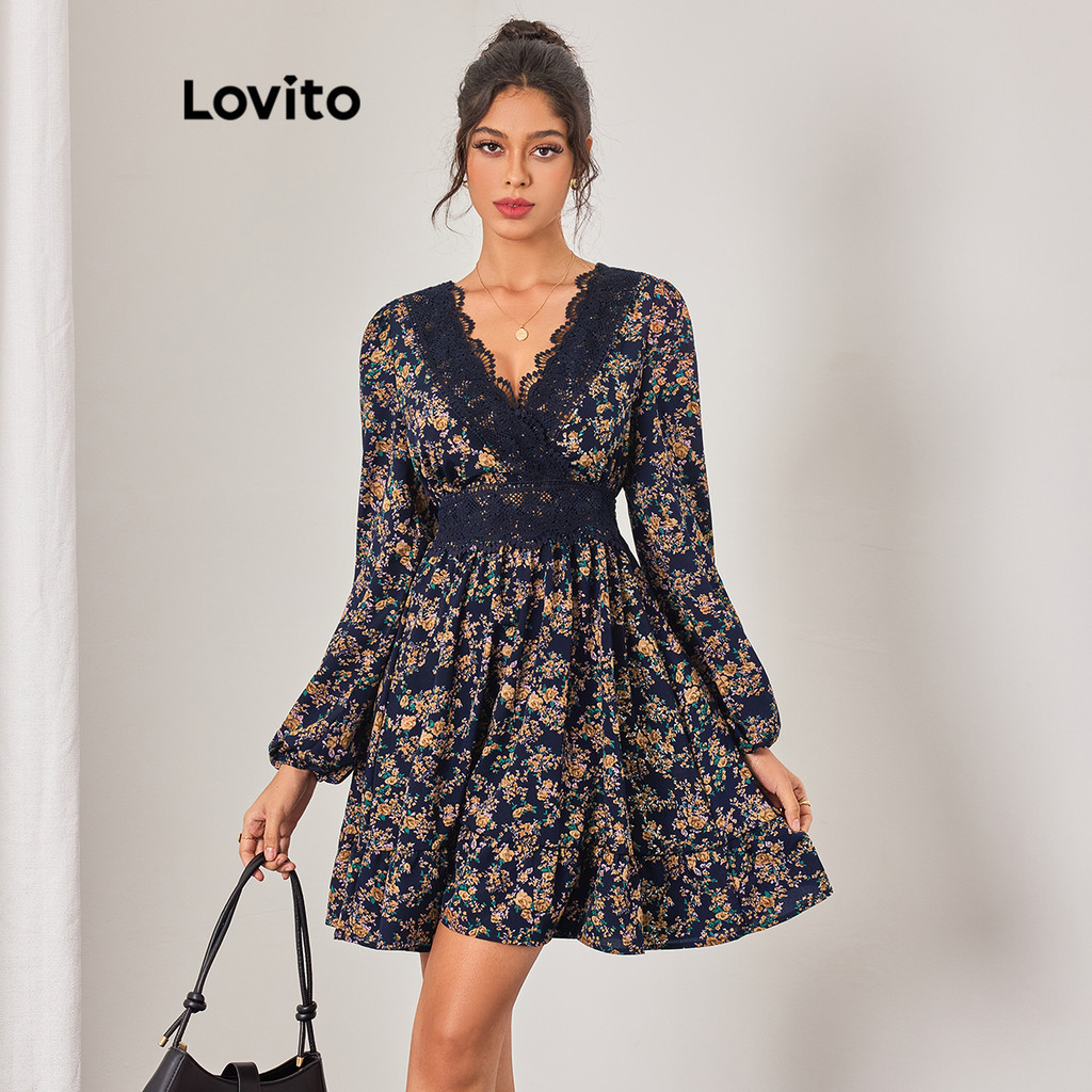 Lovito Vestido romântico floral de renda com babados e decote para mulheres LBL11410