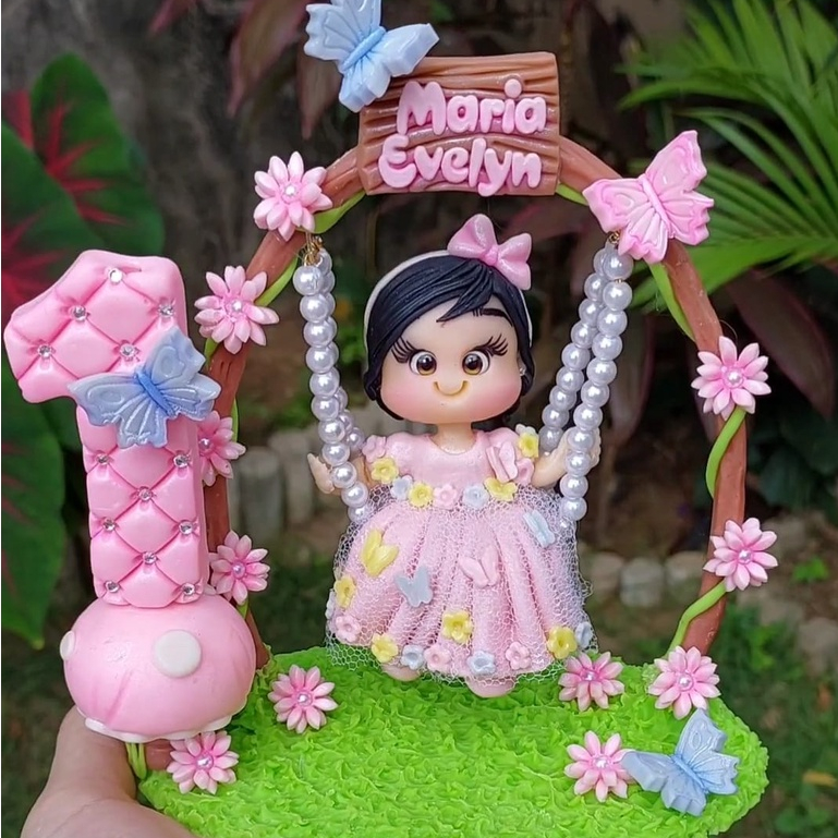 Topo de bolo com vela em biscuit tema jardim encantado, balanço jardim