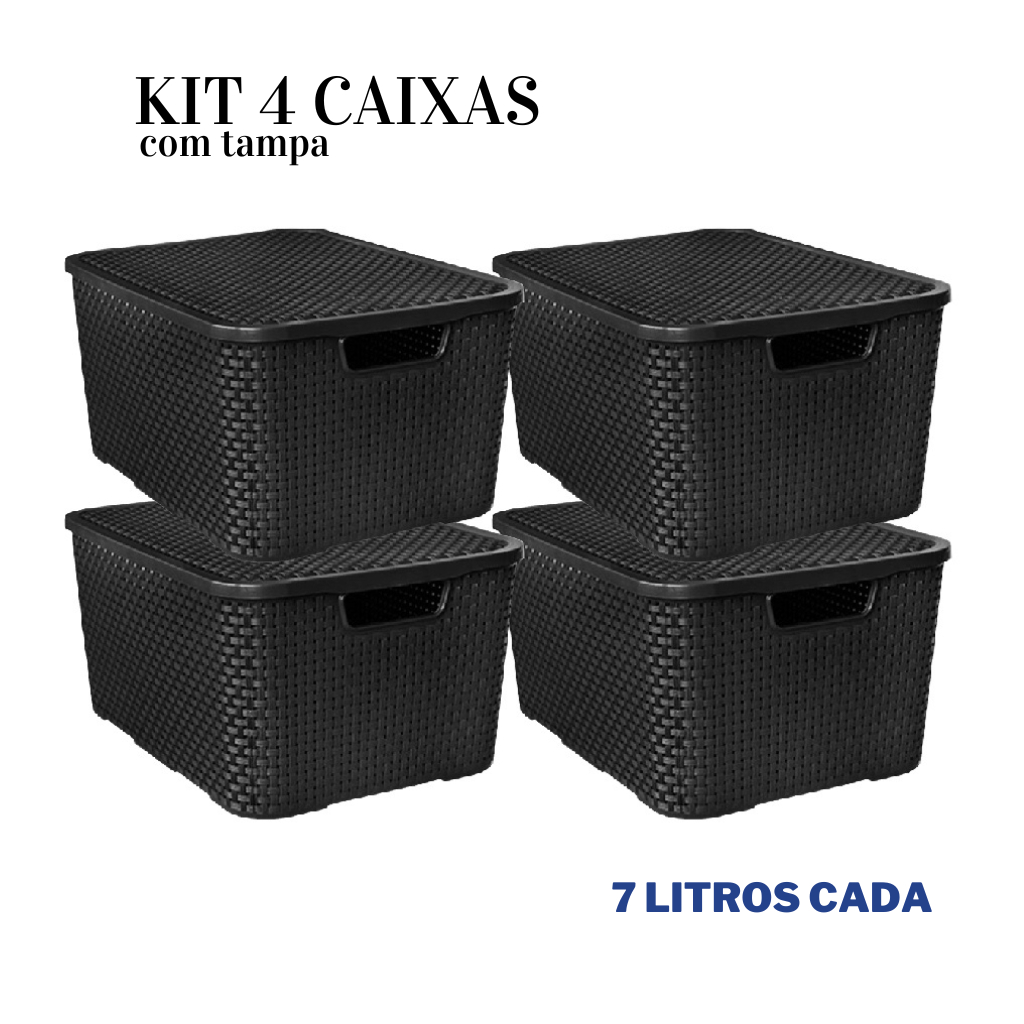 Kit 4 Caixas Organizadoras 40 Litros, 20 L, 15 L e 7 L Cesto Multiuso Rattan Com Tampa Preto
