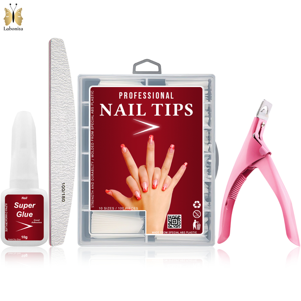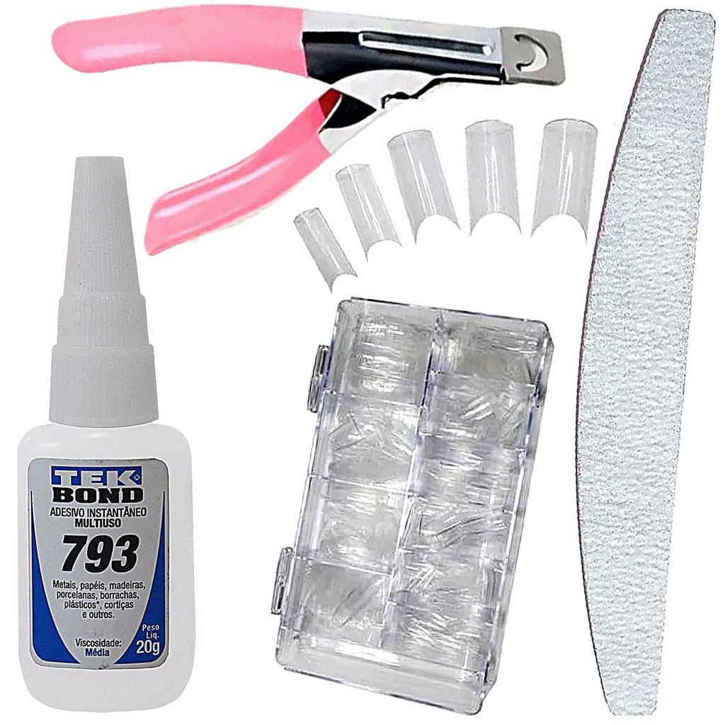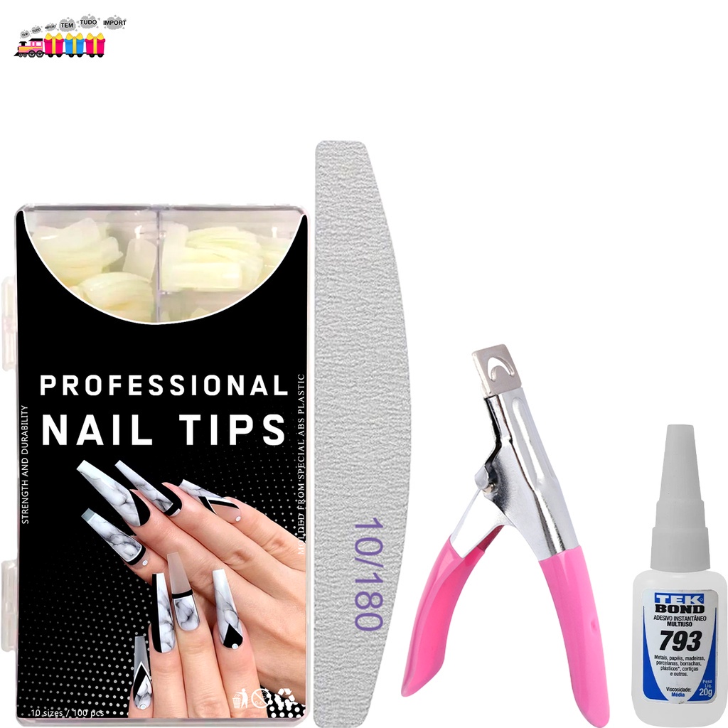 Kit Alongamento De Unha Tips Alicate Cortador de Tips + Tek Bond + Lixa Bumerangue + 100 Unhas Tips Curvatura C