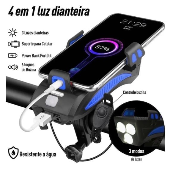 Kit Multifuncional Farol Led Bike 4 Em 1 Recarregavel Suporte Celular Power Bank