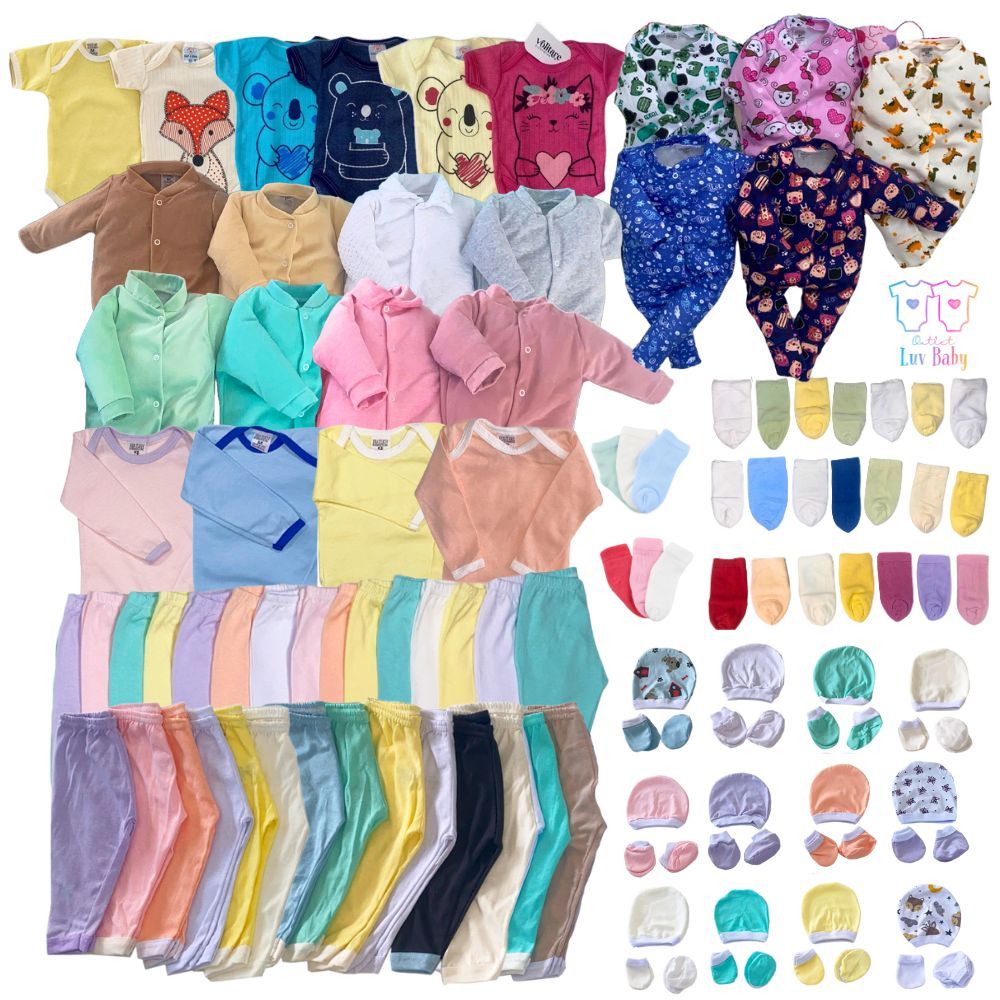 Super Kit 50 Peças Roupas de Bebê Body Macacão Calça Mijão Luvas Toucas e Meias Liso e Estampado Enxoval Maternidade