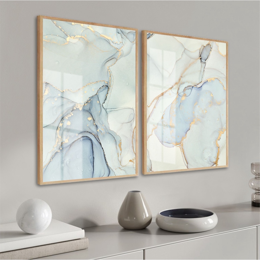 Kit 2 Quadros Abstrato Gold Azul Moldura e Vidro Sala Quarto