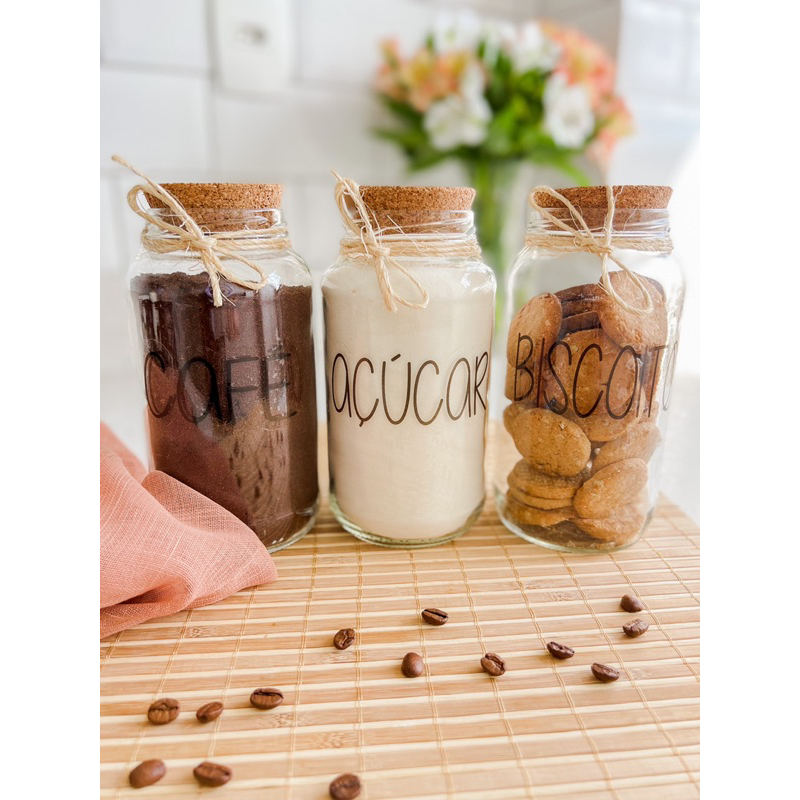 Kit Cantinho do Café + Açúcar + Biscoito | 3 potes de Vidro 810 ml + tampa rolha cortiça| Pote Mantimento