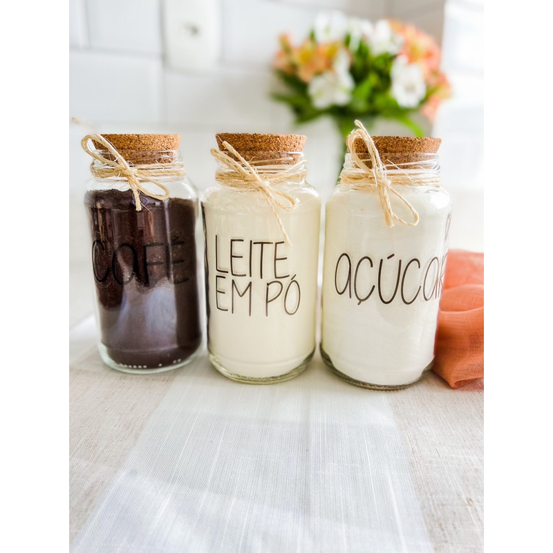 Kit Cantinho do Café + Açúcar + Leite em pó | 3 potes de Vidro 810 ml + tampa rolha cortiça| Pote Mantimento