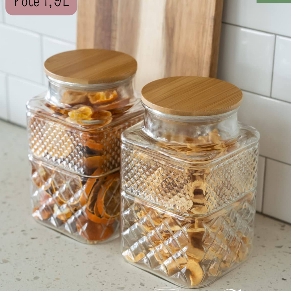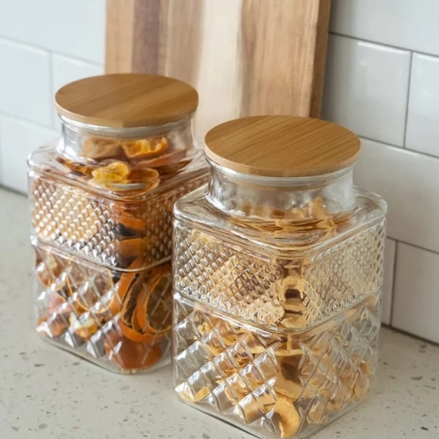 Pote de Vidro Bomboniere Porta Mantimento Café Açúcar Biscoito Com Tampa de Bambu Elegante
