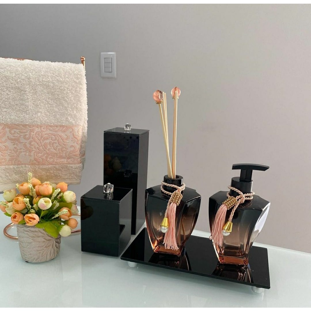 Kit Lavabo Banheiro Luxo Com Bandeja, Difusor de Ambiente Preto/Rose , Porta Escova E Saboneteira