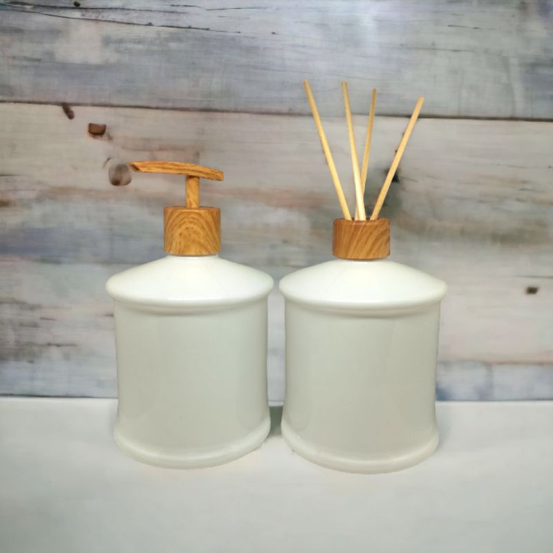 Kit Banheiro Porta sabonete líquido e Difusor Aromatizador de Varetas Branco e Bambu Frasco Pet 600ml