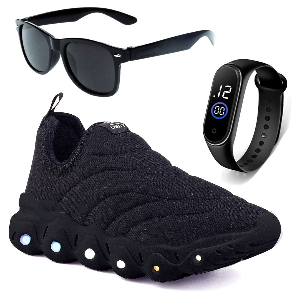 Tenis Infantil de Led Menino e Menina Calce Facil Preto e Preto e Óculos e Relógio Luizza