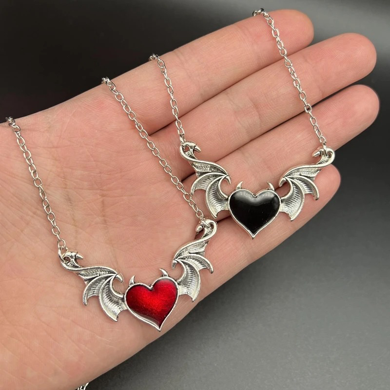 Colar Pingente de Coração com Asas e Cruz Gótico