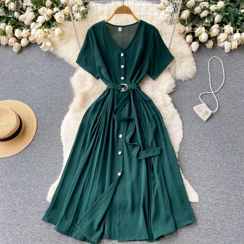 Vestido Coreano Retrô Em V De Manga Curta Chiffon Para Mulheres Vestidos De Cintura De Verão Slim Temperamento A Line
