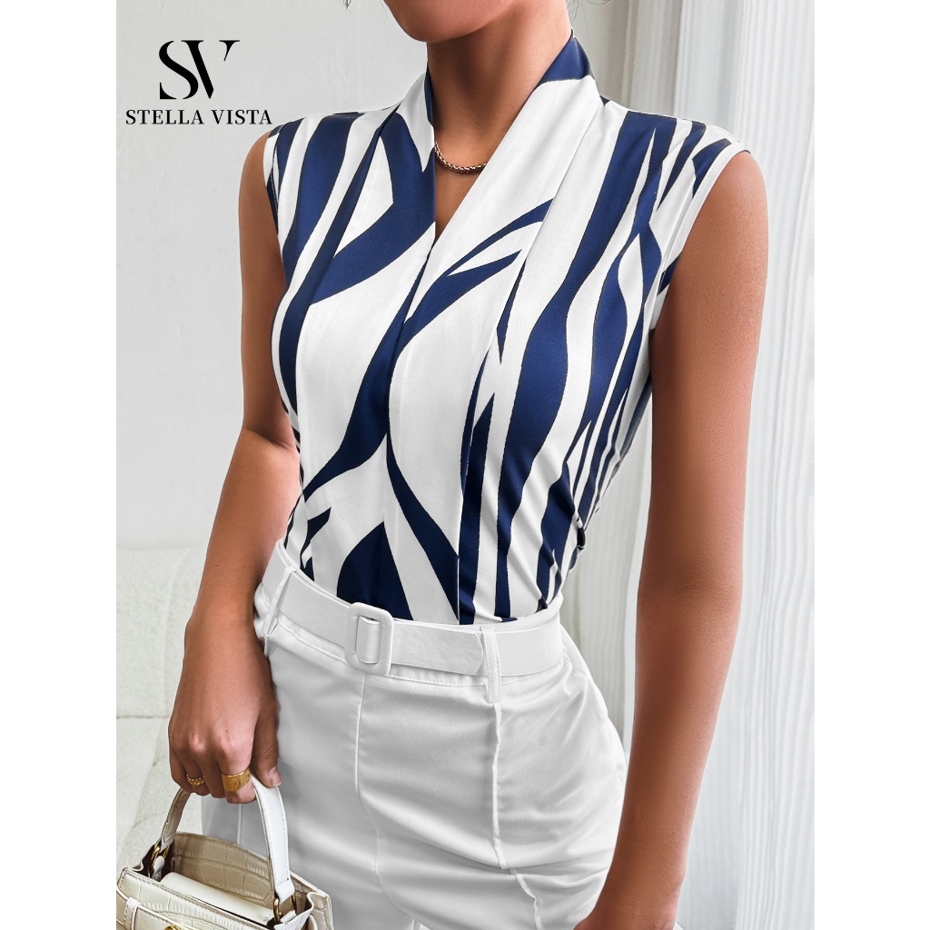 SV Blusa Feminina Elegante Estampada sem Mangas ,com design de decote em V