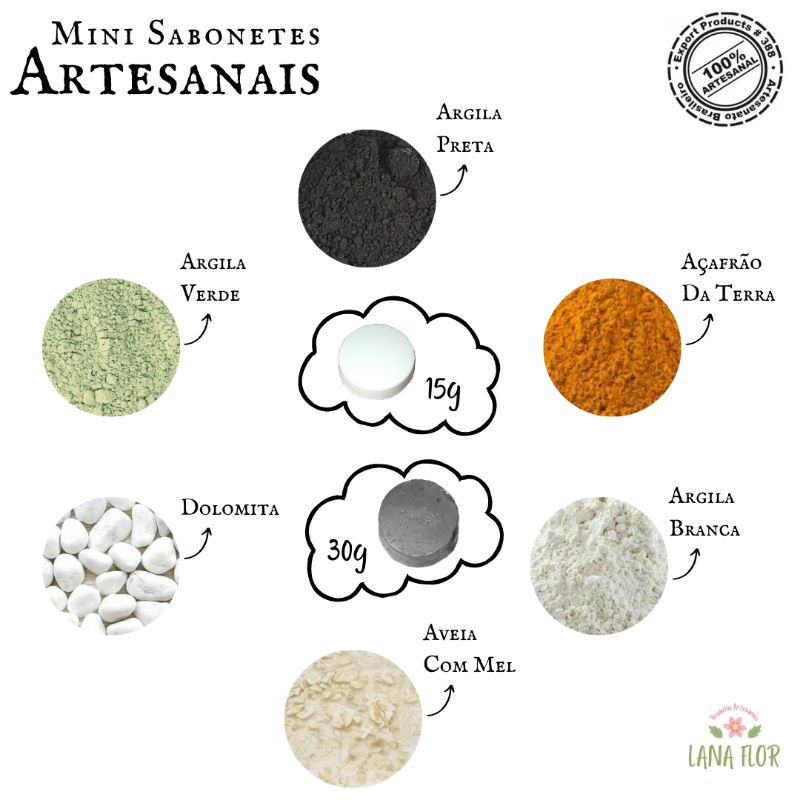 Mini Sabonete Artesanal Argila Preta, Branca e Verde, Dolomita, Açafrão e Aveia de 15g a 30g