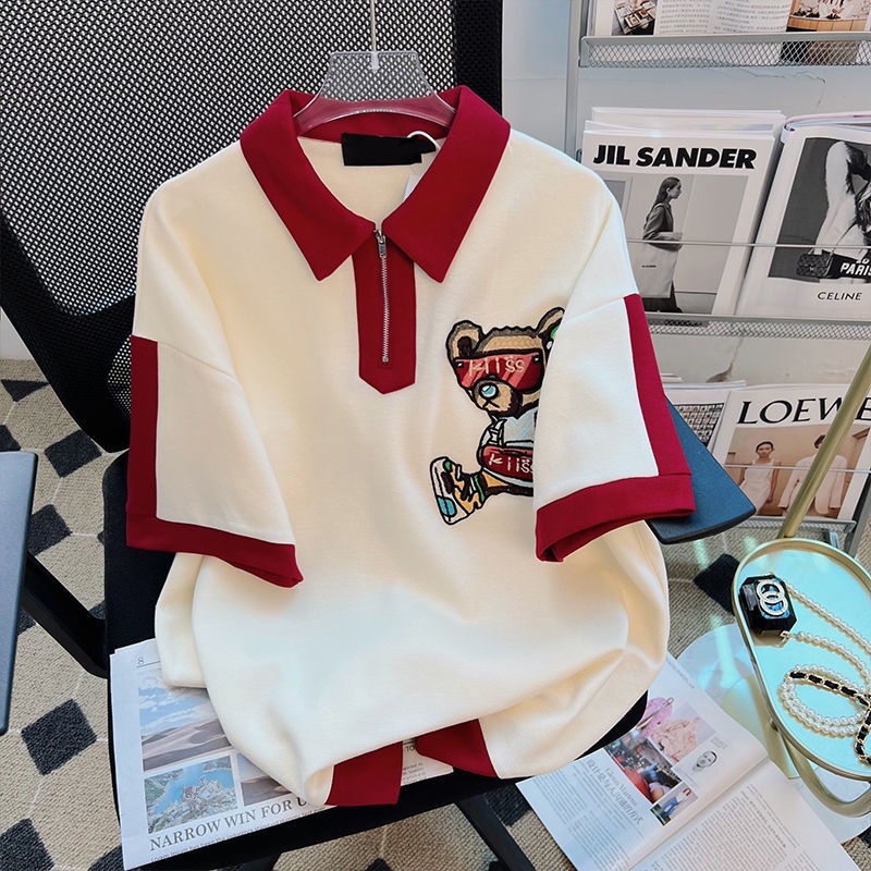 Camiseta Polo De Urso Bordado Contraste De Manga Curta Verão Novo Casual Folgada Coreana Comprimento Médio Top