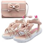 Kit Sandália Infantil Feminina Laço Menina Com Bolsa Pérolas Nude Mzkid