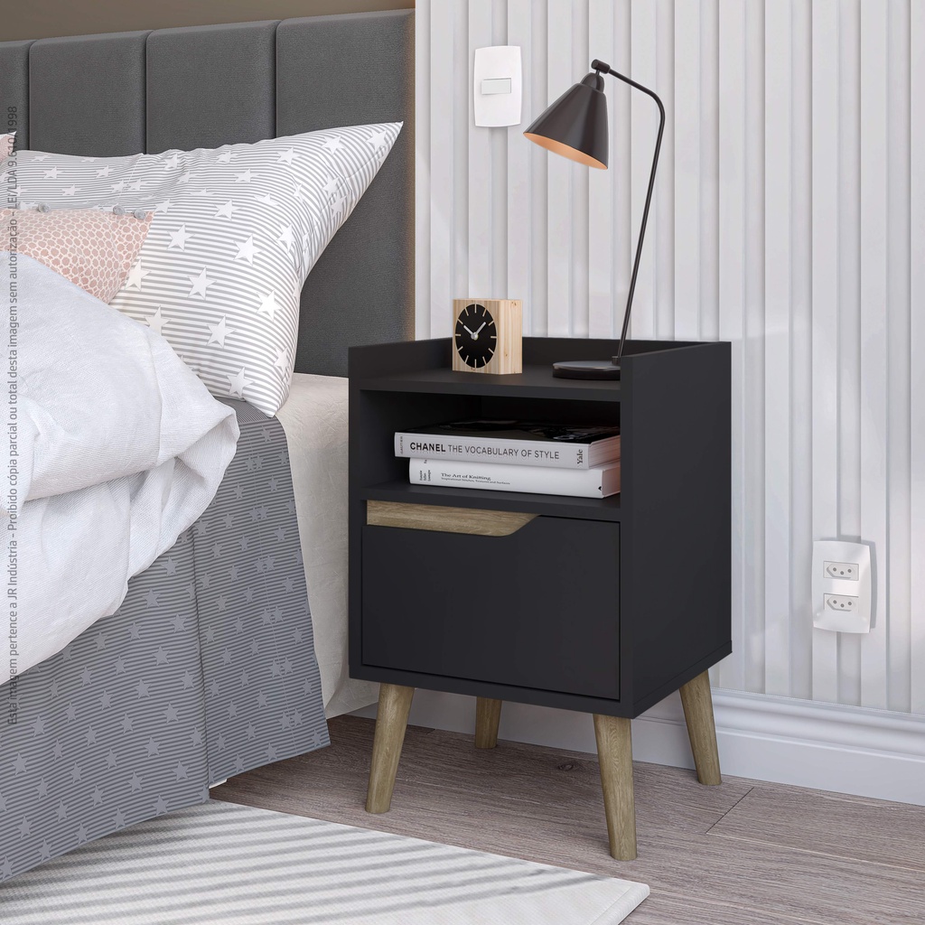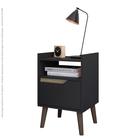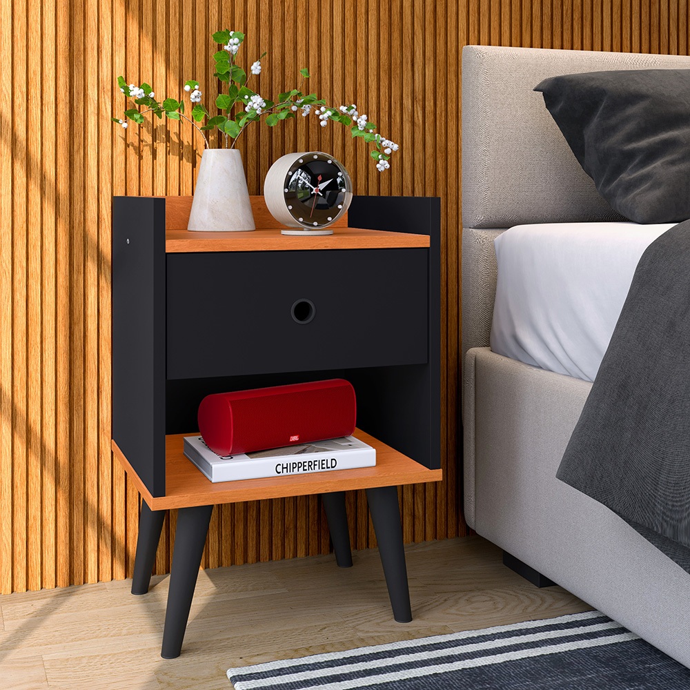 Mesa De Cabeceira Quarto Retrô Pés Palito Com Nicho e 1 Gaveta - Classic Decor - Preto Com Freijó - Lojas GB Móveis