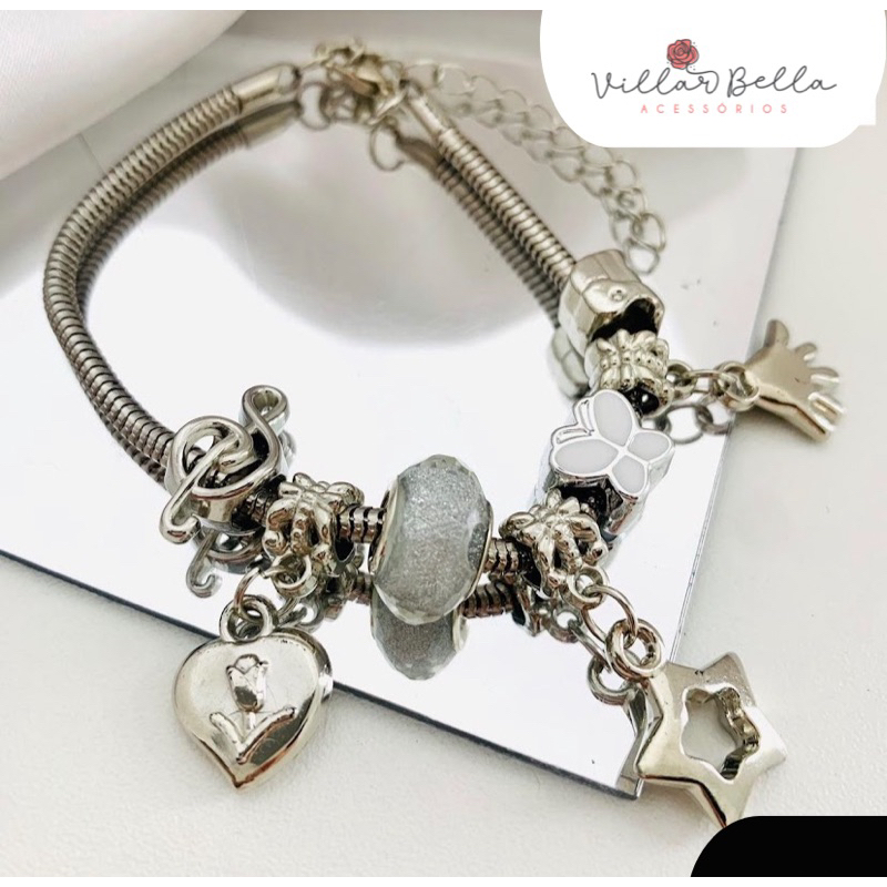 Pulseira com Berloque Feminina | Bracelete Estilo Berloques Com Pingentes Aleátorio na Cor Prata Dourado e Rose