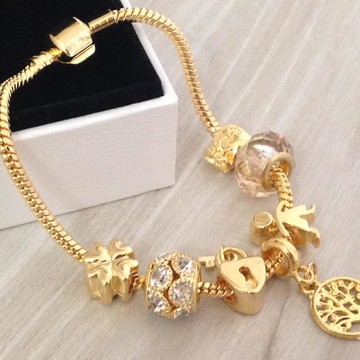 Pulseira Estilo Pandora Dourada com Berloques Sortidos Folhados