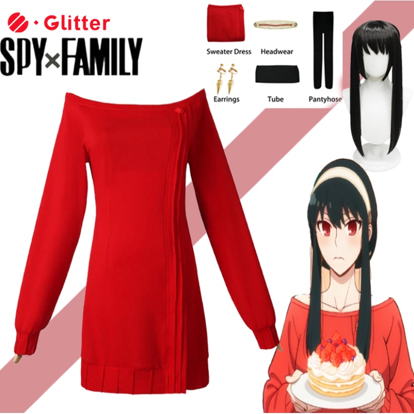 Anime Spy X Family Yor Forger Cosplay Costume Mulher Casual Sexy Vermelho Longo Vestido De Malha Sweater Peruca Cabelo Brincos Acessórios Princesa Roupas De Festa De Carnaval