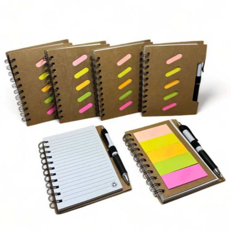 Kit Com 2/3/4/5/6/10 Caderno Ecológico Com Bloquinho Auto Adesivo Lembrete Colorido E Caneta Esferográfica