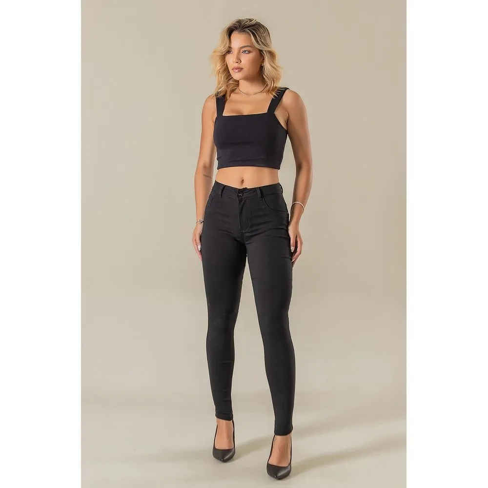 Calça Preta Feminina Em Sarja Com Elastano Cintura Alta Levanta Bumbum