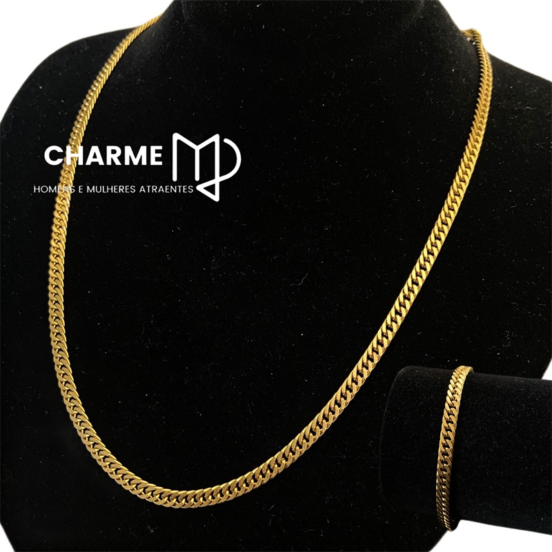 Conjunto Corrente+Pulseira Elo Duplo em aço inox 316L masculina/feminina colar banhada a ouro 60cm 4mm