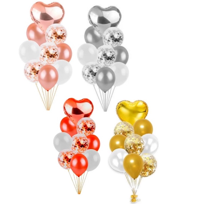 Kit 9 PÇ Buque Balões Bexiga/Balão Metalizado Coração Dourado Rose Gold Prata Vermelho