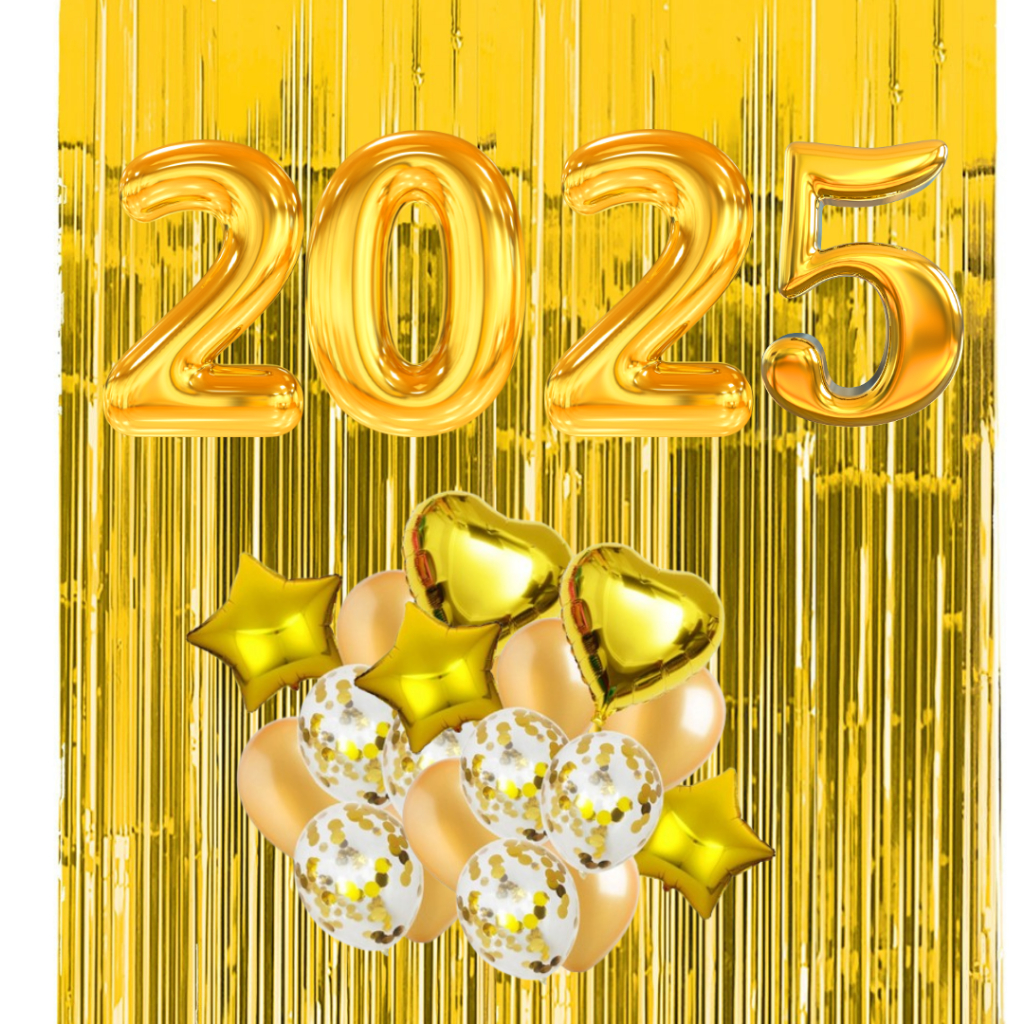 Kit Balão 2025 + Buquê + 2 Cortinas Metalizadas Franja Ano Novo Decoração Reveillon