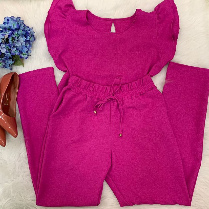 Conjunto Feminino Casual Elegante Blusa Calça em Linho De Algodão Com Babado Na Manga Diversas Cores Roupa Feminina Festa Barata Promoção